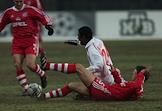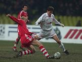 Футболист команды "Спартак" Дмитрий Парфенов (слева) в борьбе за мяч. Второй матч между командами "Спартак" (Москва) и "Bayern" (Мюнхен), проходивший на стадионе "Лужники", завершился поражением московского "Спартака" со счетом 0 : 3.