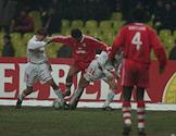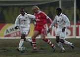 Игрок московского "Спартака" Луис Робсон (слева) и игрок команды "Bayern" (Мюнхен) Патрик Андерсон (справа) в борьбе за мяч. Второй матч между этими командами завершился поражением московского "Спартака" со счетом 0 : 3.