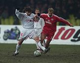 Футболист московской команды "Спартак" Дмитрий Ананко (слева) и игрок команды "Bayern" (Мюнхен) Торстен Финк (справа) в борьбе за мяч. Второй матч между командами "Спартак" (Москва) и "Bayern" (Мюнхен), проходивший на стадионе "Лужники", завершился поражением московского "Спартака" со счетом 0 : 3.