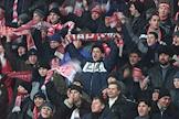 Болельщики московской команды "Спартак" на трибуне стадиона "Лужники". Второй матч между командами "Спартак" (Москва) и "Bayern" (Мюнхен) завершился поражением московского "Спартака" со счетом 0 : 3.
