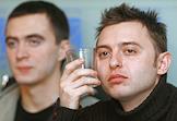 Лидер группы "Звери" Рома Билык (слева) и продюсер группы "Звери" Александр Войтинский (справа) на пресс-конференции, посвященной выходу нового альбома группы "Звери" "Когда мы вместе, никто не круче!". Пресс-конференция прошла в РИА "Новости".