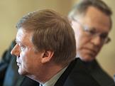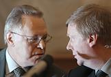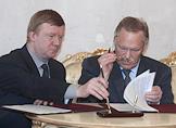 Председатель экспертной комиссии премии "Глобальная энергия" Владимир Фортов (слева) и председатель правления РАО "ЕЭС России" Анатолий Чубайс (справа) во время подписания соглашения о сотрудничестве между РАО "ЕЭС России" и Российской академии наук. Подписание прошло в зале президиума РАН.