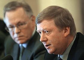 Председатель правления РАО "ЕЭС России" Анатолий Чубайс (слева) и председатель экспертной комиссии премии "Глобальная энергия" Владимир Фортов (справа) во время подписания соглашения о сотрудничестве между РАО "ЕЭС России" и Российской Академией Наук (РАН). Подписание прошло в зале президиума РАН.