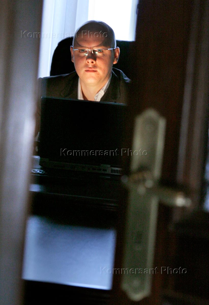 Представитель Ассоциации обманутых вкладчиков, председатель Общественного антикоррупционного комитета Антон Беляков в своем рабочем кабинете.