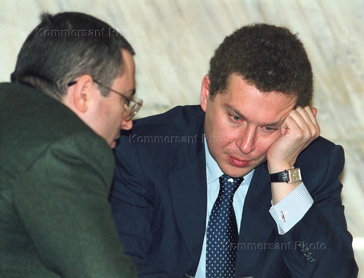 Глава финансово-промышленной группы "ЮКОС - Роспром - Менатеп" Михаил Ходорковский (слева) и советник Президента России Александр Лившиц (справа) на заседании правления Российского союза промышленников и предпринимателей в "Президент-отеле".