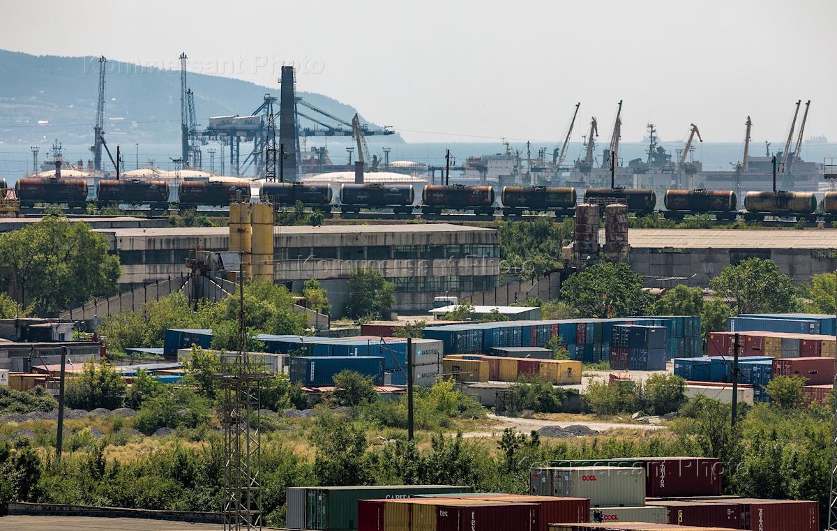 Виды города Новороссийска. Морской порт города. Контейнерная стоянка.