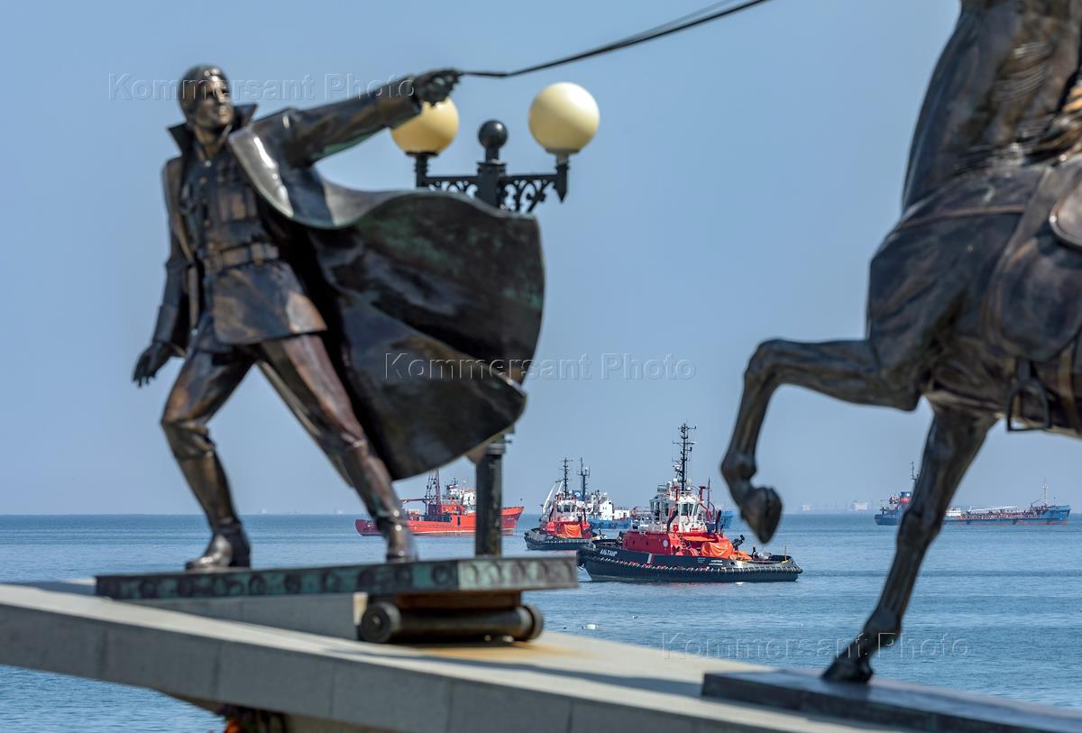 Виды города Новороссийска. Памятник белогвардейцам "Исход", установленный на набережной, напоминает о событиях гражданской войны.