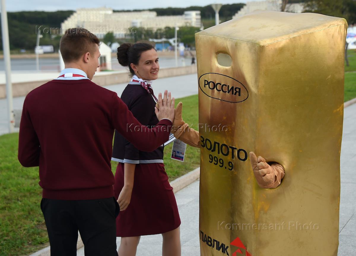 Eastern Ecomonic Forum (EEF-2018). Day three. Genre photo. Participants of the forum with gold figure doll.