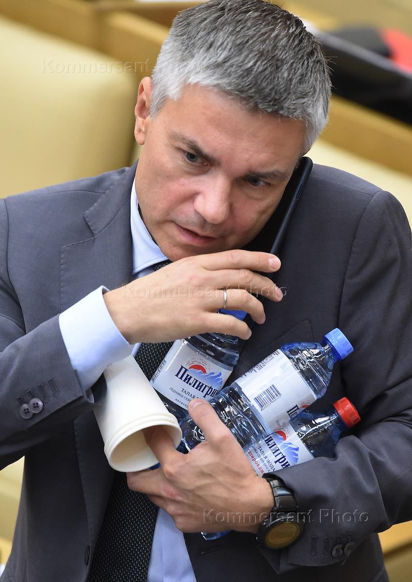 Пленарное заседание Государственной думы (ГД) России. Слева направо: председатель комитета ГД России по международным делам Леонид Слуцкий, заместитель председателя ГД России Петр Толстой и председатель комитета ГД России по экологии и охране окружающей среды Владимир Бурматов перед началом заседания.