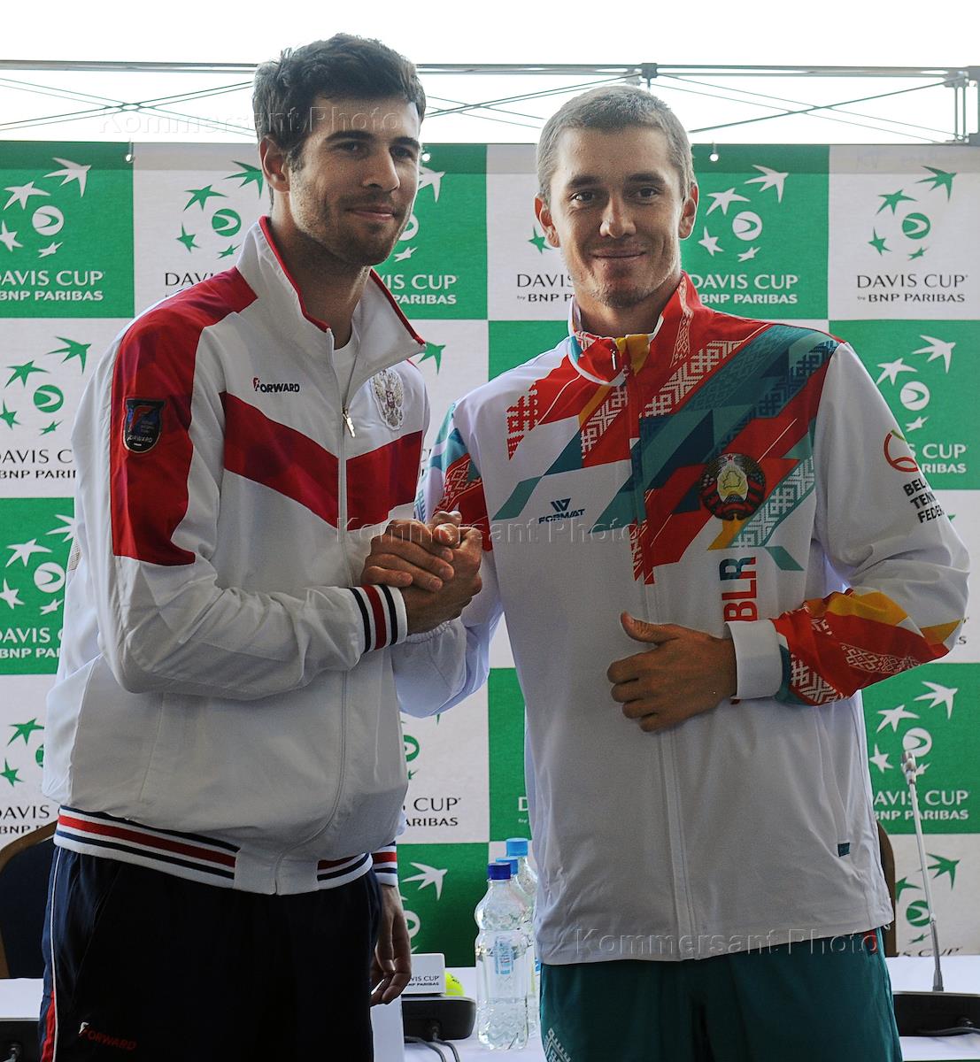 Официальная церемония жеребьевки матча мужского командного Чемпионата мира по теннису "Кубок Дэвиса" между сборными России и Беларуси прошла на станции фуникулера "Воробьевы горы". Член сборной России по теннису Карен Хачанов (слева) и член сборной Беларуси по теннису Егор Герасимов (справа) после окончания церемонии.