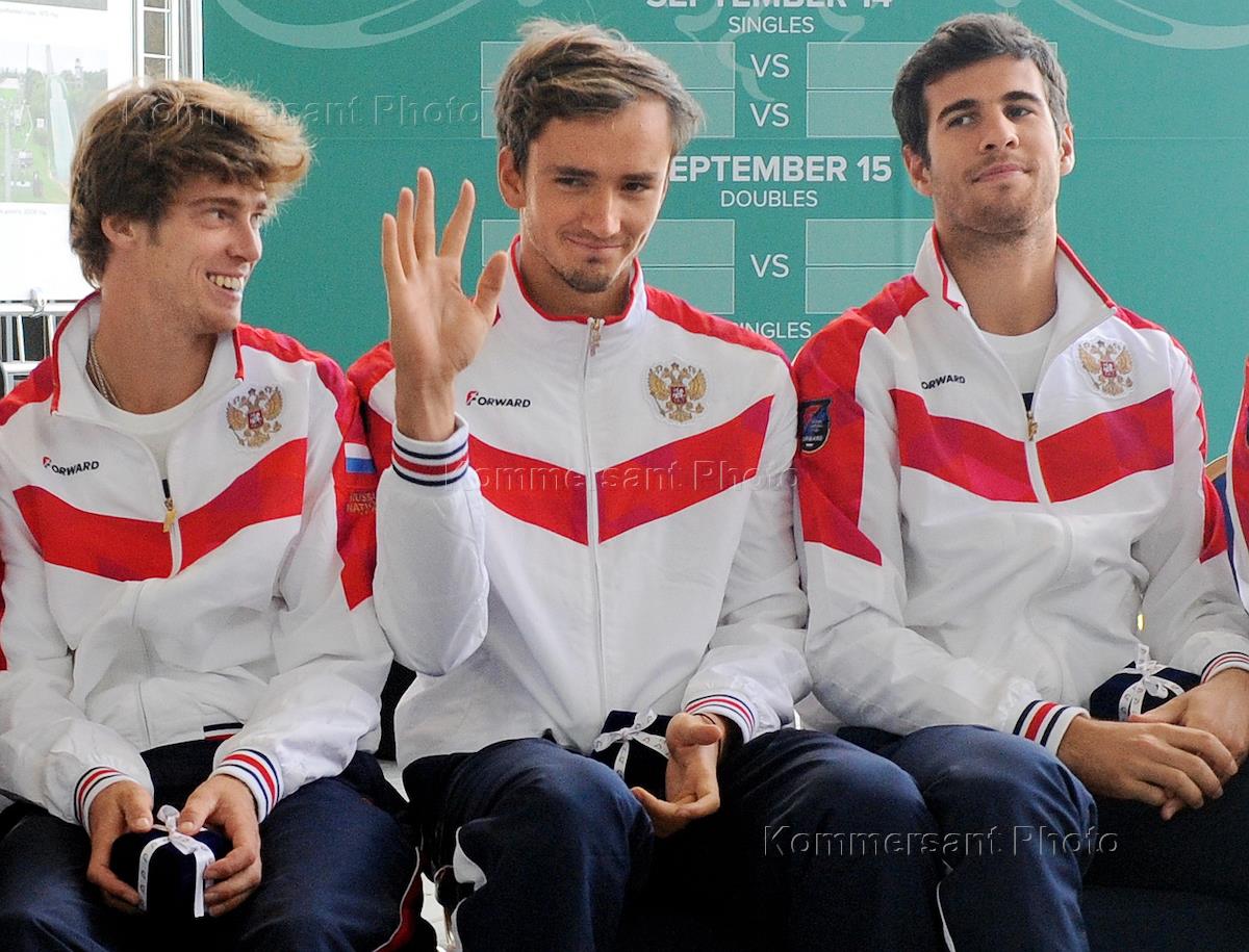 Официальная церемония жеребьевки матча мужского командного Чемпионата мира по теннису "Кубок Дэвиса" между сборными России и Беларуси прошла на станции фуникулера "Воробьевы горы". Слева направо: члены сборной России по теннису Карен Хачанов, Евгений Донской и Даниил Медведев после окончания церемонии.