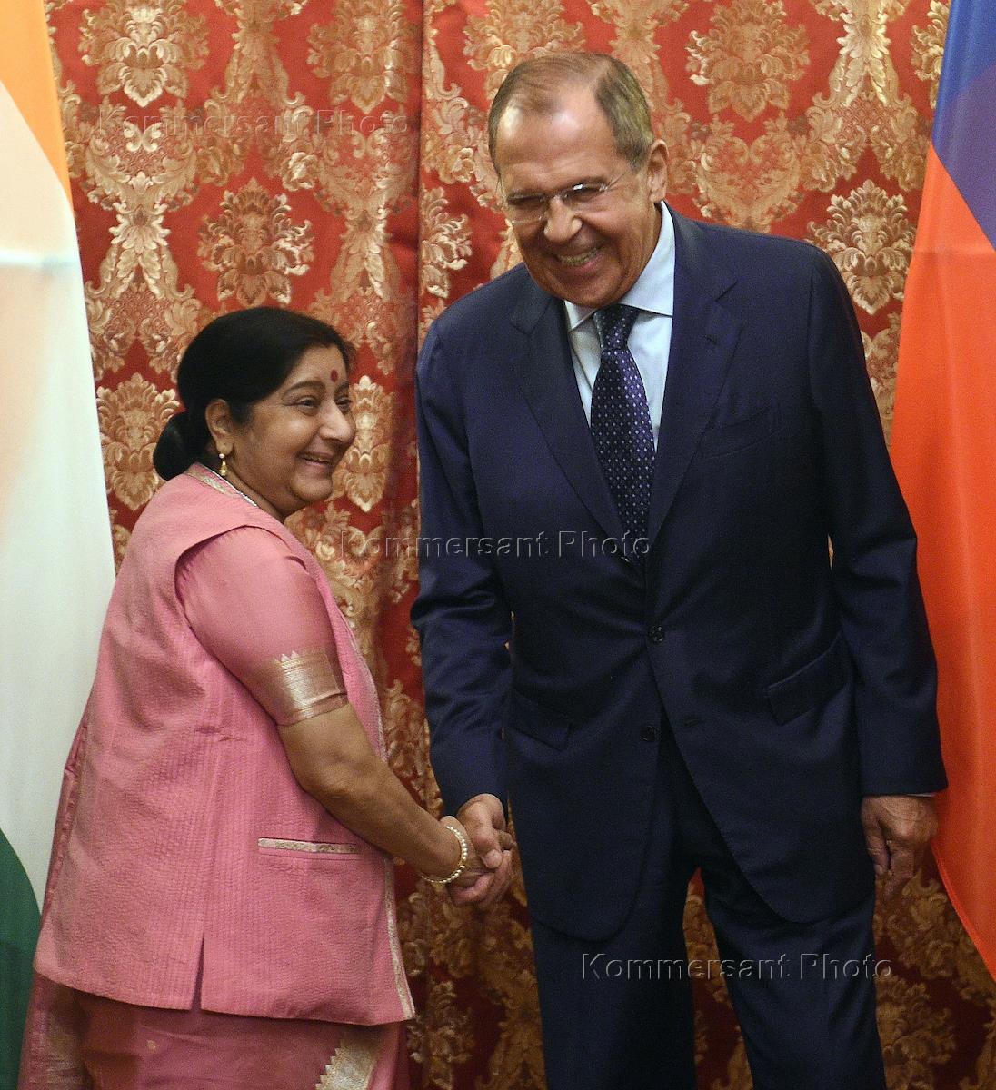 Indian Foreign Minister Sushma Swaraj (left) and Russian Foreign Minister Sergei Lavrov (right) during the meeting at Russian Foreign Ministry's Reception House.