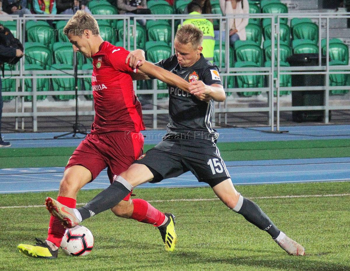 Russian premiere league 2018/2019. Tour seven. Match between Ufa football team (Russia, Ufa) and CSKA football team (Russia, Moscow) at Neftyannik stadium. Ufa football player Lovro Bizyak (left) and CSKA football player Ivan Oblyakov (right) during the match.