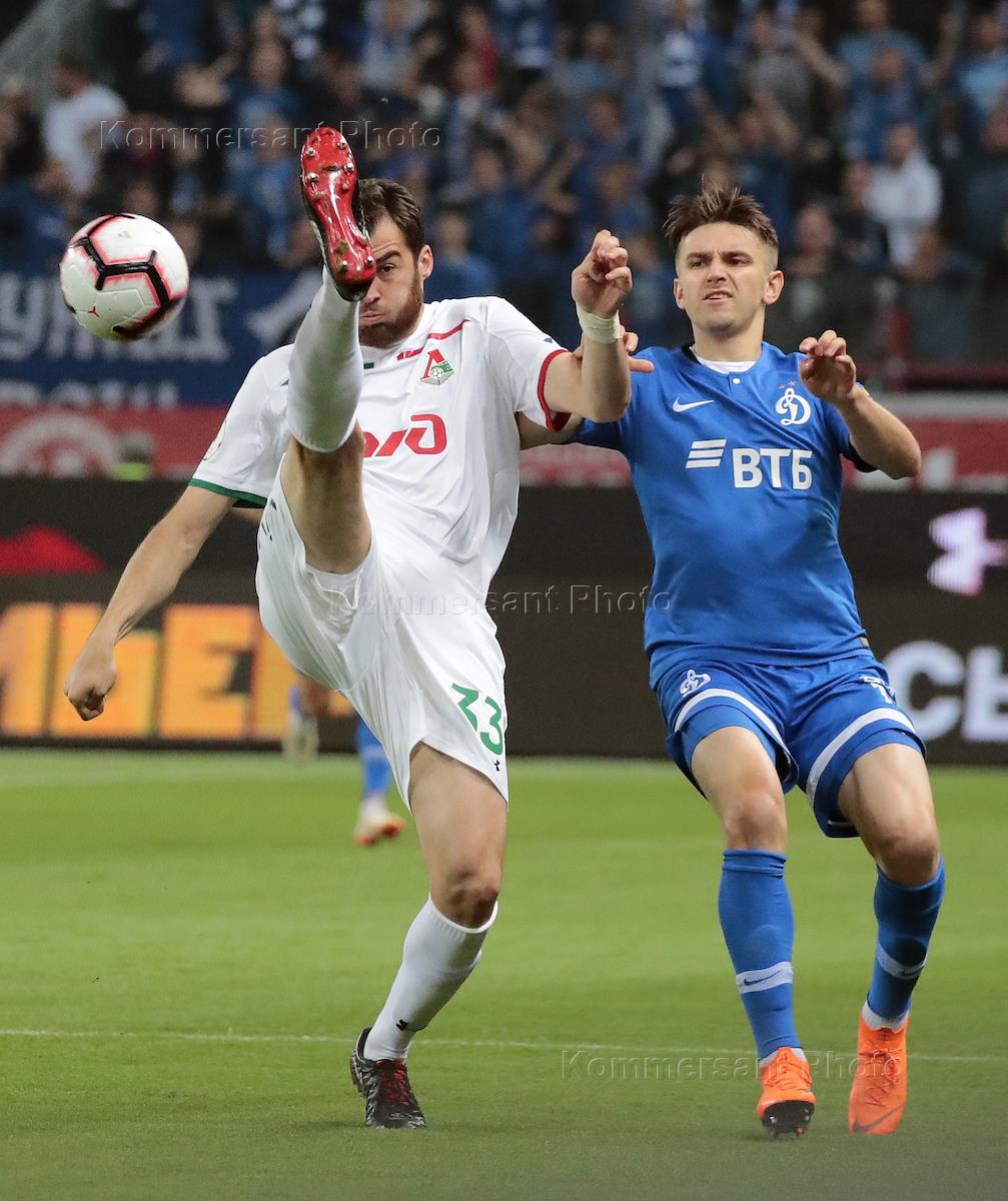 Russian premiere league 2018/2019. Tour seven. Match between Lokomotiv football team (Russia, Moscow) and Dinamo football team (Russia, Moscow) at RZHD Arena stadium. Dinamo football player Fedor Chernykh (right) and Lokomotiv football player Solomon Karkvelia (left) during the match.