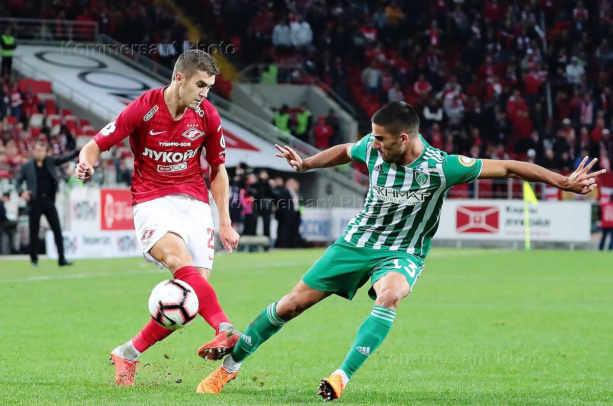 Russian premiere league 2018/2019. Tour eight. Match between Spartak football team (Moscow) and Akhmat football team (Grozny) at Otkritie Arena stadium. Spartak football players Gregoriy Dzhikiya (left) and Artyom Rebrov (right) during the match.