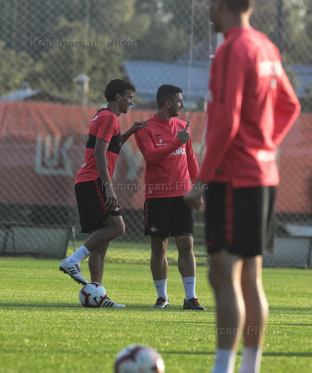 Open training of Spartak football team at sport base in Tarasovsk. Spartak football players Roman Eremenko (left) and Lucas Fernando (center) during the training.