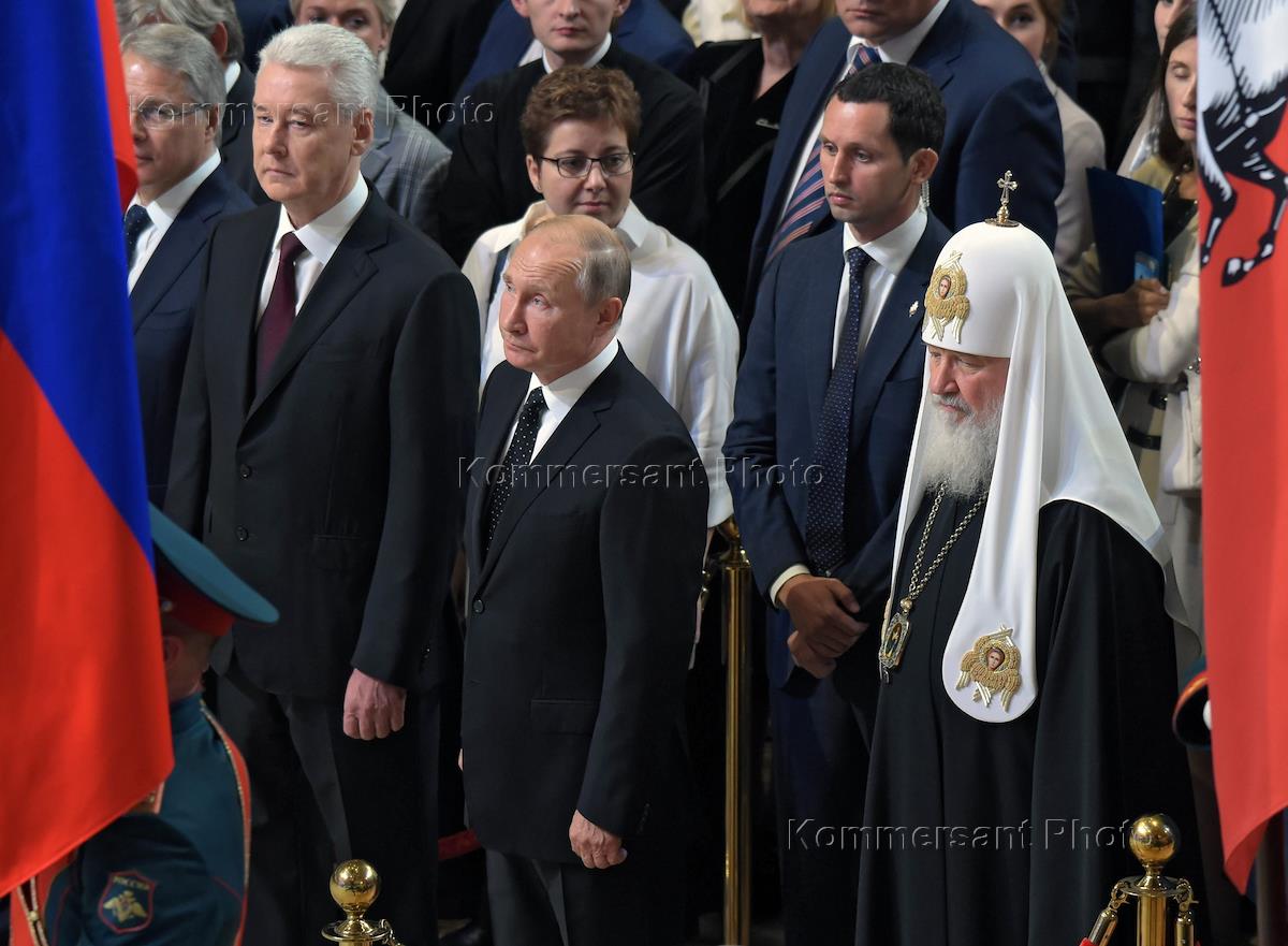 Moscow concert hall "Zaryadie" hosted the innauguration ceremony of the mayor. From the right to the left: the patriarkh of Moscow and Russia Kirill, President of Russia Vladimir Putin, the elected mayor of Moscow Sergei Sobyanin.