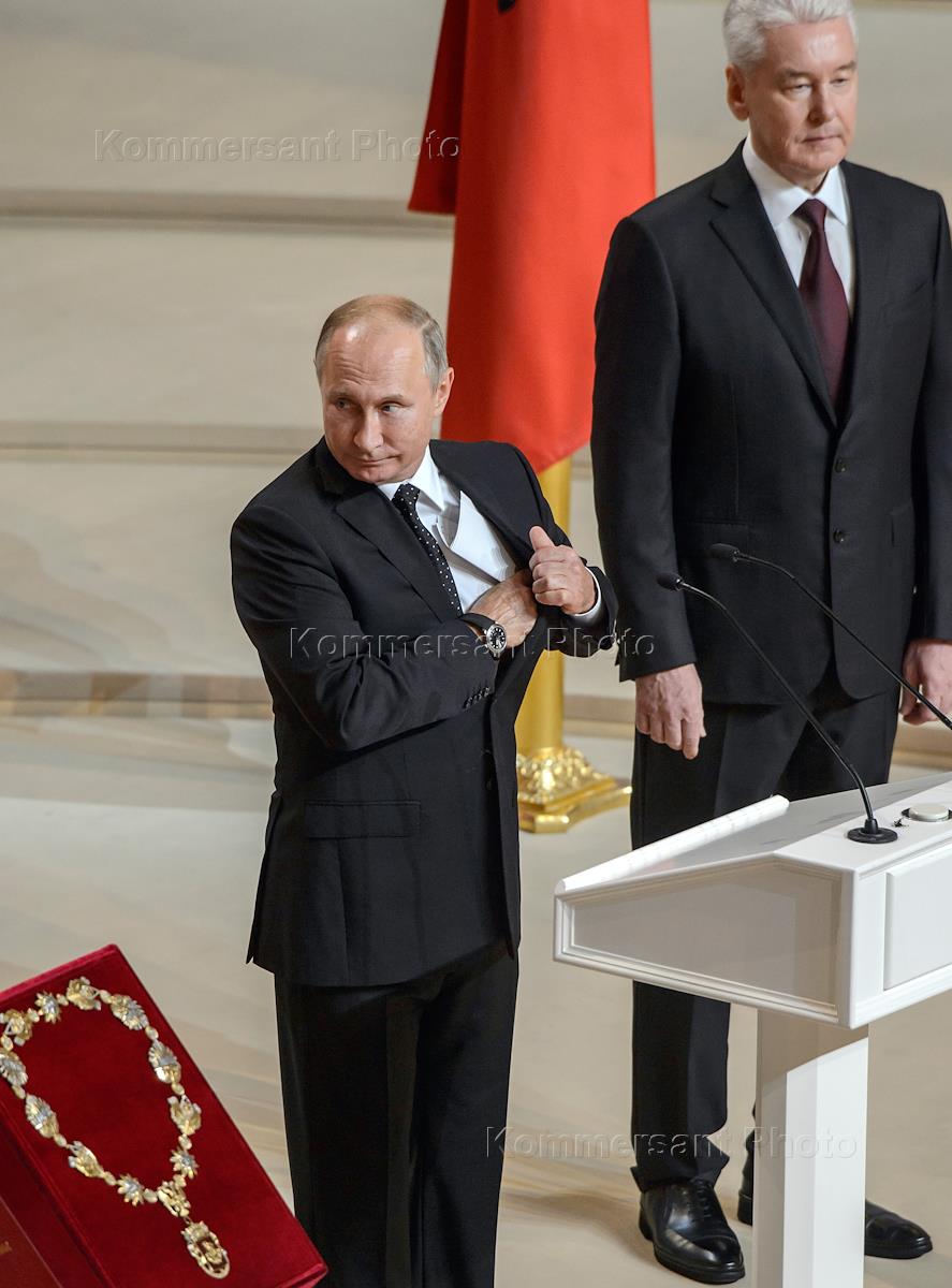 Торжественная церемония инаугурации мэра Москвы прошла в Московском концертном зале "Зарядье". Избранный мэр Москвы Сергей Собянин (справа) и президент России Владимир Путин (слева) во время церемонии.