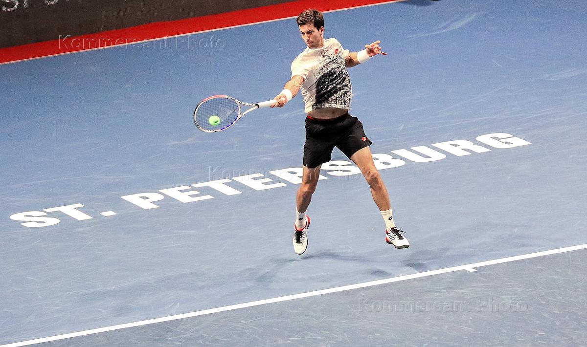 Saint-Petersburg open tennis championship 2018. First day. Slovenian tennis player Aljaz Bedenen during the match with Swiss tennis player Stan Wawrinka.