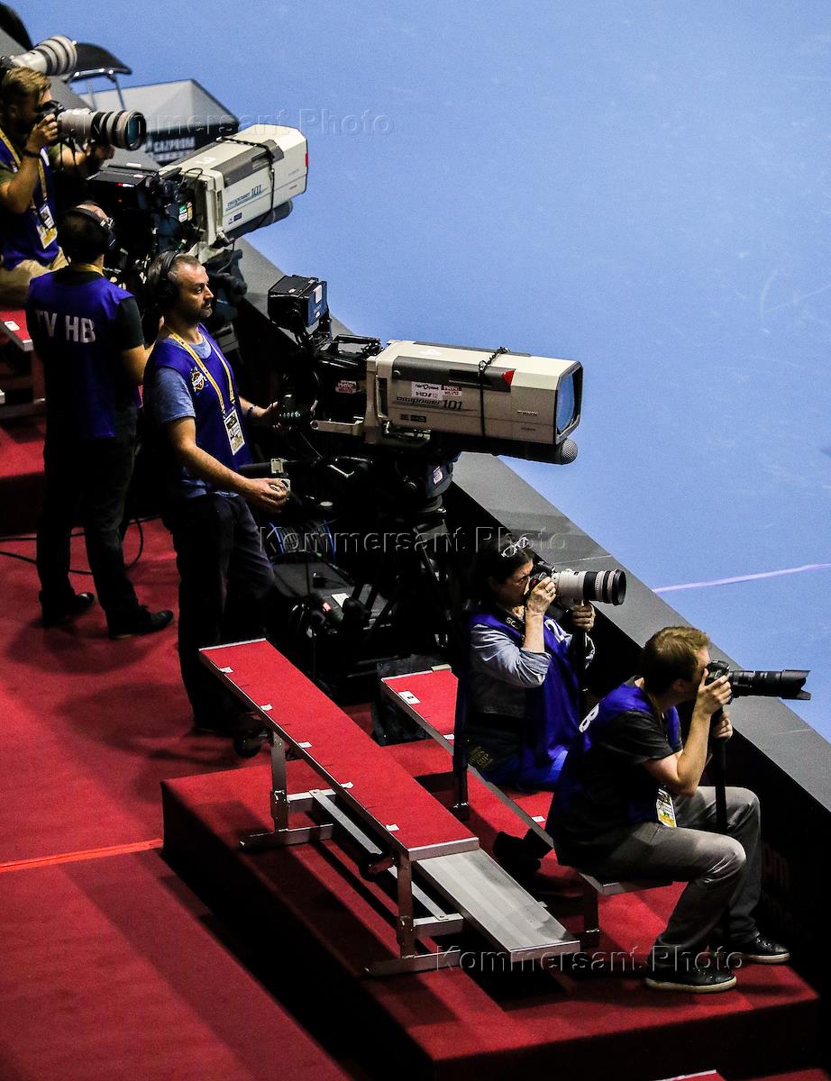Saint-Petersburg open tennis championship 2018. First day. Swiss tennis player Stan Wawrinka (left) during the match with Slovenian tennis player Aljaz Bedenen (center).