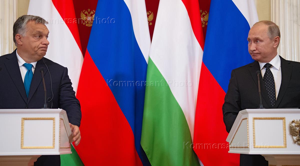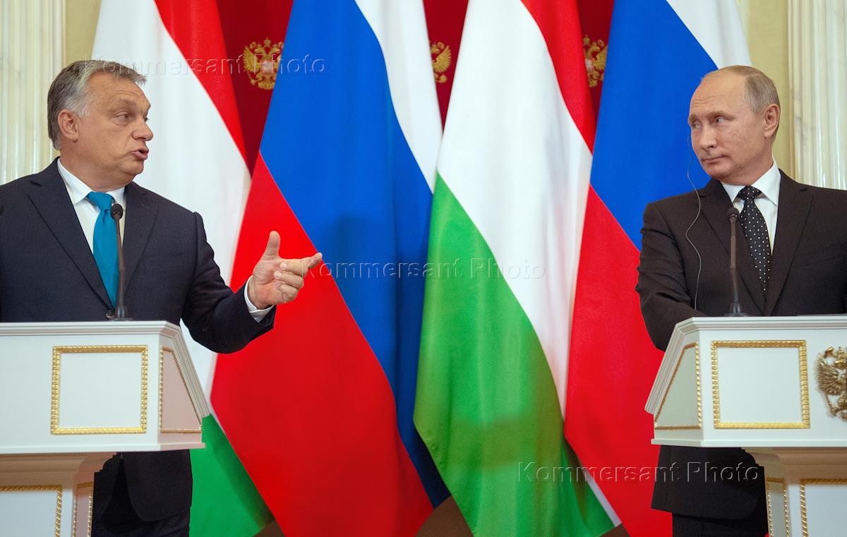 Премьер-министр Венгрии Виктор Орбан (слева) и президент России Владимир Путин (справа) во время встречи в Кремле.