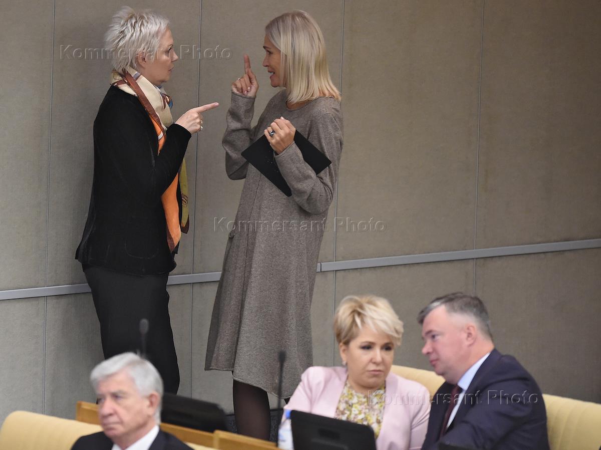 Пленарное заседание Государственной думы (ГД) России. "Правительственный час" с участием министра сельского хозяйства России Дмитрия Патрушева. Член комитета ГД России по труду, социальной политике и делам ветеранов Татьяна Кривенко (слева) и член комитета ГД России по государственному строительству и законодательству Ирина Белых (справа) перед началом заседания.