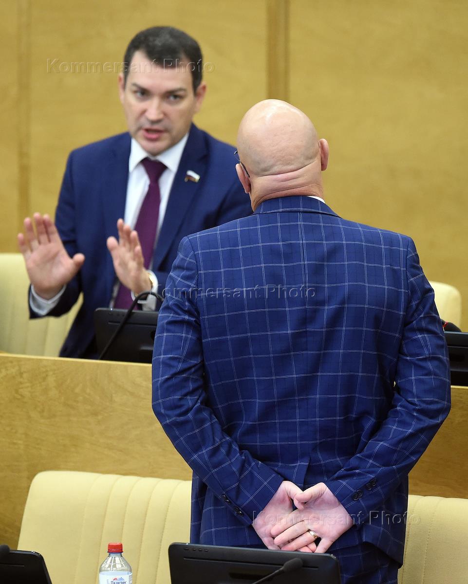 Пленарное заседание Государственной думы (ГД) России. Член комитета ГД России по информационной политике, информационным технологиям и связи Максим Кудрявцев (слева) и член комитета ГД России по природным ресурсам, собственности и земельным отношениям Константин Слыщенко (справа) перед началом заседания.