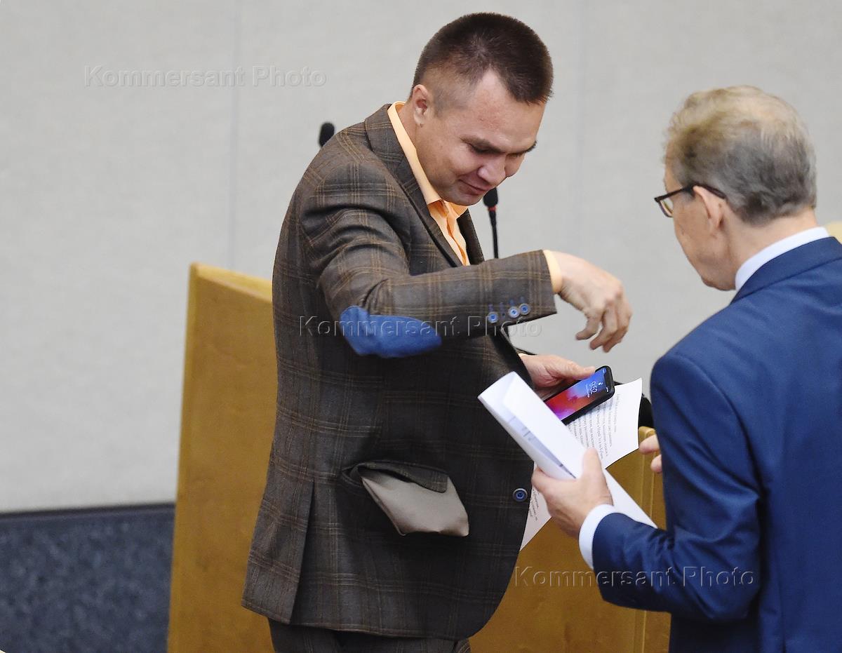 Пленарное заседание Государственной думы (ГД) России. Член комитета ГД России по информационной политике, информационным технологиям и связи Максим Кудрявцев (слева) и член комитета ГД России по природным ресурсам, собственности и земельным отношениям Константин Слыщенко (справа) перед началом заседания.