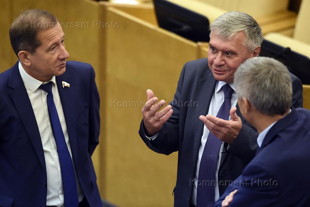 Пленарное заседание Государственной думы (ГД) России. Член комитета ГД России по обороне Алексей Хохлов (слева), член комитета ГД России по аграрным вопросам Валентин Суббот (второй слева) и член комитета ГД России по образованию и науке Гаджимет Сафаралиев (в центре) перед началом заседания.