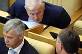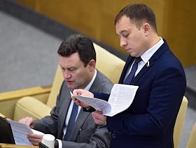 Пленарное заседание Государственной думы (ГД) России. Член комитета ГД России по транспорту и строительству Сергей Веремеенко (слева) и член комитета ГД России по природным ресурсам, собственности и земельным отношениям Михаил Бугера (справа) во время заседания.