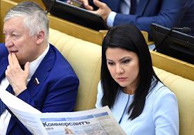 Пленарное заседание Государственной думы (ГД) России. Заместитель председателя комитета ГД России по международным делам Анатолий Карпов (слева) и член комитета ГД России по вопросам семьи, женщин и детей Инга Юмашева (справа) во время заседания.