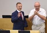 Пленарное заседание Государственной думы (ГД) России. Член комитета ГД России по энергетике Александр Каминский (слева) и член комитета ГД России по информационной политике, информационным технологиям и связи Юрий Березуцкий (в центре) перед началом заседания.