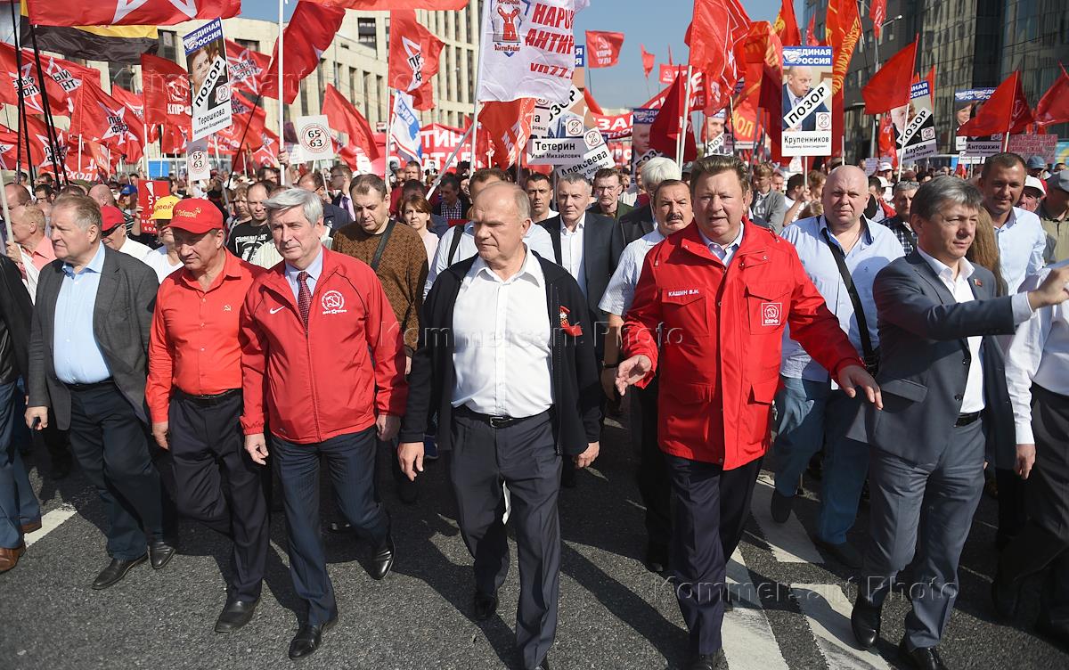 Шествие и митинг против пенсионной реформы правительства, организованные Коммунистической партией России (КПРФ) и народно-демократическими левыми обществами и движениями, прошли в рамках третьего этапа Общероссийской протестной акции. Справа налево: председатель комитета ГД России по аграрным вопросам Владимир Кашин, лидер КПРФ, член комитета ГД России по делам Содружества Независимых Государств, евразийской интеграции и связям с соотечественниками Геннадий Зюганов, первый заместитель председателя ГД России Иван Мельников и первый заместитель председателя комитета ГД России по делам национальностей Валерий Рашкин во время шествия.