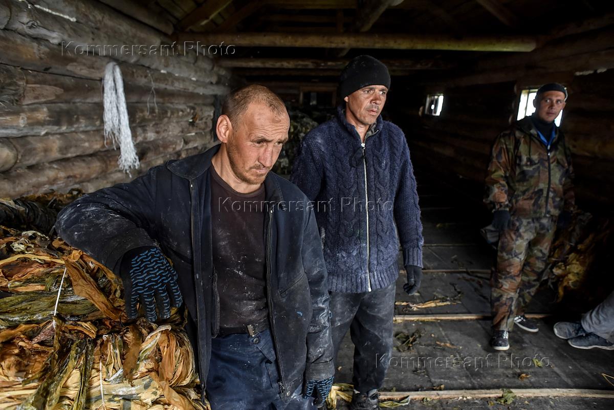 Соловецкие острова. Закрытый для туризма остров Малая Муксалма. Добыча морских водорослей. Бригада рабочих сдает сухие водоросли на склад. Ссборщики морских водорослей.