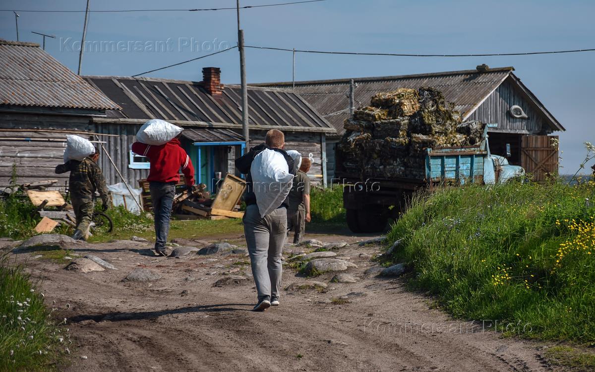 Соловецкие острова. Закрытый для туризма остров Малая Муксалма. Добыча морских водорослей. Бригада рабочих сдает сухие водоросли.