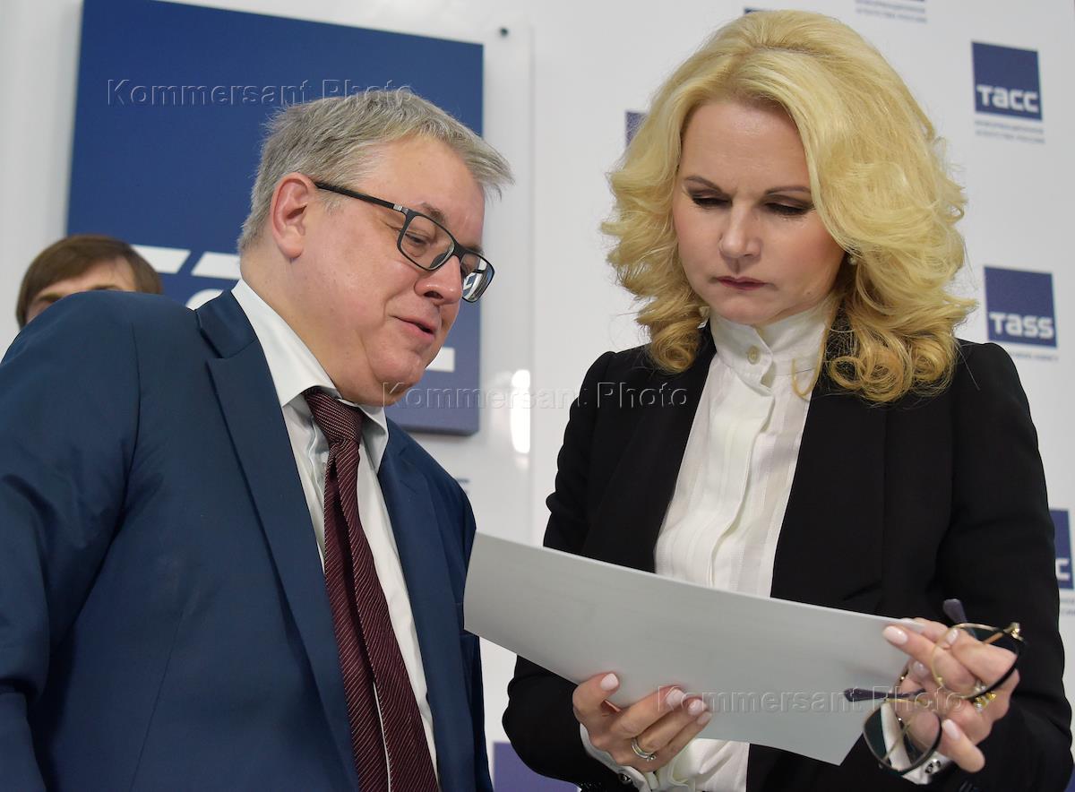Пресс-конференция, посвященная результатам исследования среднего балла абитуриентов, зачисленных на бюджетные места в российские государственные высшие учебные заведения по результатам ЕГЭ в 2018 году, прошла в агентстве ТАСС. Заместитель председателя правительства России Татьяна Голикова (справа) и руководитель Федеральной службы России по надзору в сфере образования и науки Сергей Кравцов (слева) во время пресс-конференции.