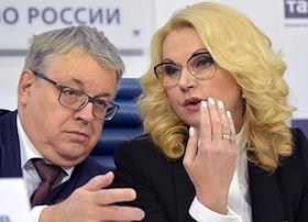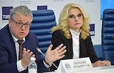 Пресс-конференция, посвященная результатам исследования среднего балла абитуриентов, зачисленных на бюджетные места в российские государственные высшие учебные заведения по результатам ЕГЭ в 2018 году, прошла в агентстве ТАСС. Заместитель председателя Правительства России Татьяна Голикова (справа) и руководитель Федеральной службы по надзору в сфере образования и науки Сергей Кравцов (слева) во время пресс-конференции.