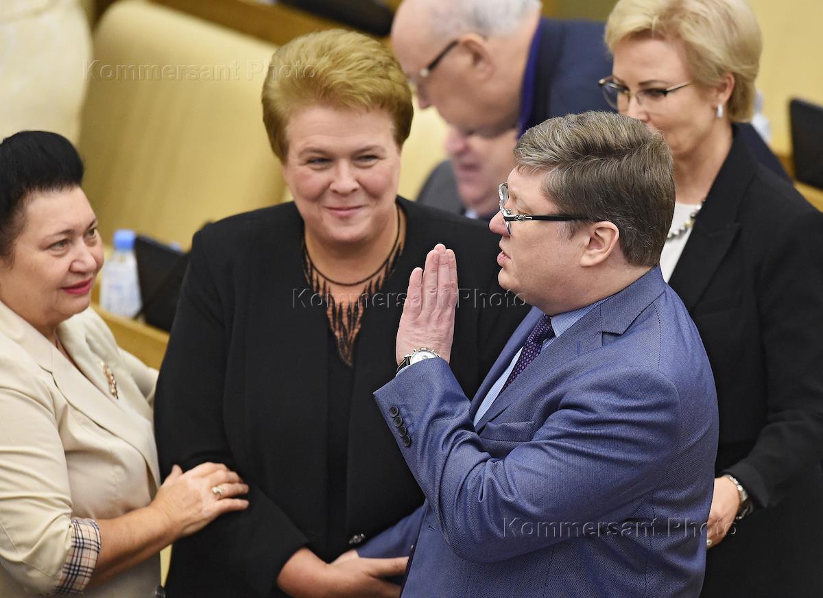Пленарное заседание Государственной думы (ГД) России. Слева направо: заместитель председателя комитета ГД России по энергетике Дмитрий Исламов, член комитета ГД России по контролю и Регламенту Раиса Кармазина и член комитета ГД России по энергетике Александр Карелин перед началом заседания.
