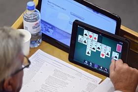 Пленарное заседание Государственной думы (ГД) России. Жанровая фотография. Депутаты ГД России на рабочих местах.