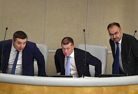 Пленарное заседание Государственной думы (ГД) России. Слева направо: министр труда и социальной защиты России Максим Топилин, первый заместитель председателя комитета ГД России по делам национальностей Валерий Рашкин и председатель правления Пенсионного фонда России Антон Дроздов во время заседания.