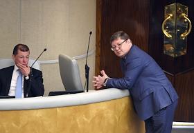 Пленарное заседание Государственной думы (ГД) России. Член комитета ГД России по бюджету и налогам Андрей Исаев (слева) и заместитель председателя Государственной думы России, руководитель фракции партии "Единая Россия" Сергей Неверов (в центре) перед началом заседания.