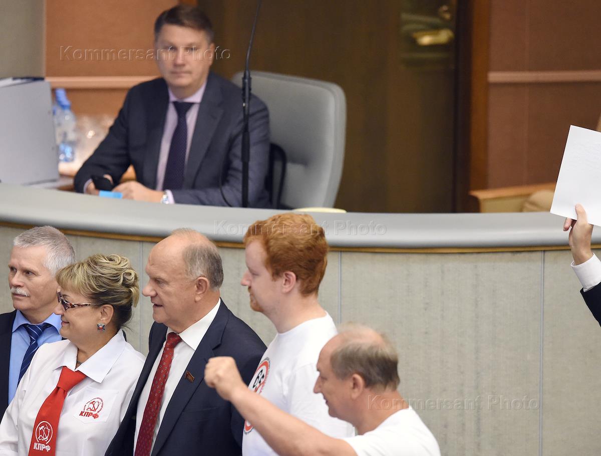 Пленарное заседание Государственной думы (ГД) России. Слева направо: член комитета ГД России по экономической политике, промышленности, инновационному развитию и предпринимательству Сергей Пантелеев, депутат ГД России Ольга Алимова, лидер КПРФ, член комитета ГД России по делам Содружества Независимых Государств, евразийской интеграции и связям с соотечественниками Геннадий Зюганов, член комитета ГД России по федеративному устройству и вопросам местного самоуправления Денис Парфенов и первый заместитель председателя комитета ГД России по делам национальностей Валерий Рашкин во время заседания.