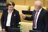 Пленарное заседание Государственной думы (ГД) России. Заместитель председателя комитета ГД России по федеративному устройству и вопросам местного самоуправления Валентина Терешкова (слева) и первый заместитель председателя комитета ГД России по финансовому рынку Игорь Дивинский (справа) перед началом заседания.
