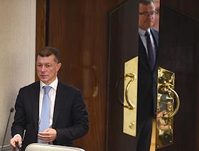 Пленарное заседание Государственной думы (ГД) России. Слева направо: министр труда и социальной защиты России Максим Топилин, первый заместитель председателя комитета ГД России по делам национальностей Валерий Рашкин и председатель правления Пенсионного фонда России Антон Дроздов во время заседания.