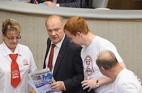 Пленарное заседание Государственной думы (ГД) России. Лидер КПРФ, член комитета ГД России по делам Содружества Независимых Государств, евразийской интеграции и связям с соотечественниками Геннадий Зюганов (справа) перед началом заседания.