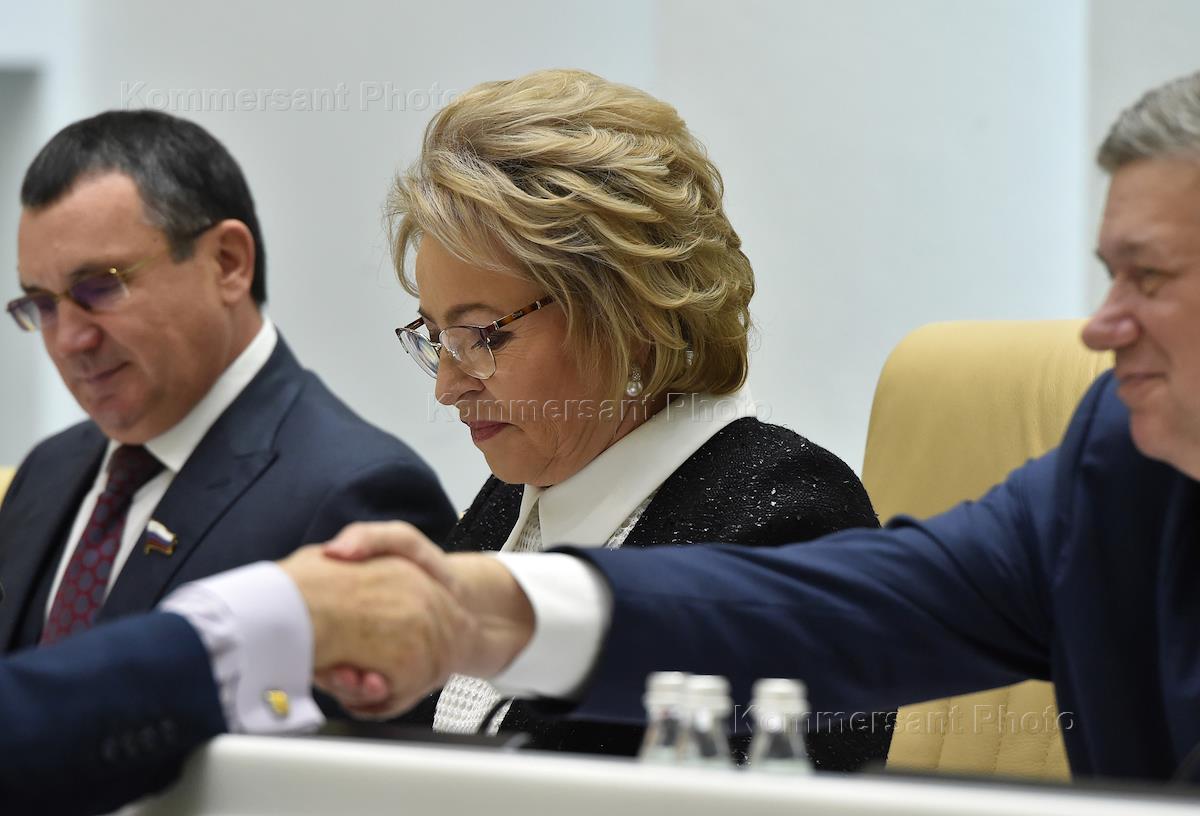 Пленарное заседание Совета Федерации (СФ) России. Председатель СФ России Валентина Матвиенко (в центре) и ее заместители Николай Федоров (слева) и Евгений Бушмин (справа) на заседания.