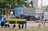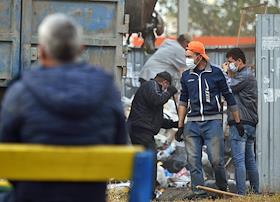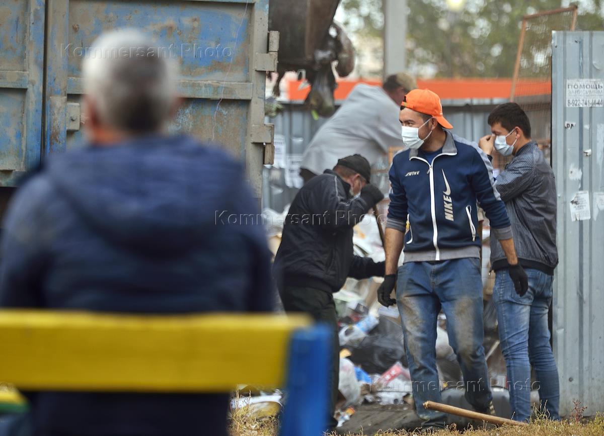 Мусорный кризис в Челябинске. Сотрудники компании по вывозу мусора разбирают завалы мусора во дворе жилого дома.
