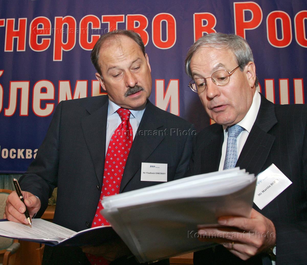 Председатель "Внешэкономбанка" Владимир Дмитриев (слева) и директор группы Euromoney в Центральной и Восточной Европы и СНГ Мартин Борн (справа) во время конференции "Государственно - частное партнерство в России: проблемы и решения", организованной "Внешэкономбанком". Конференция прошла в "Президент-отеле".