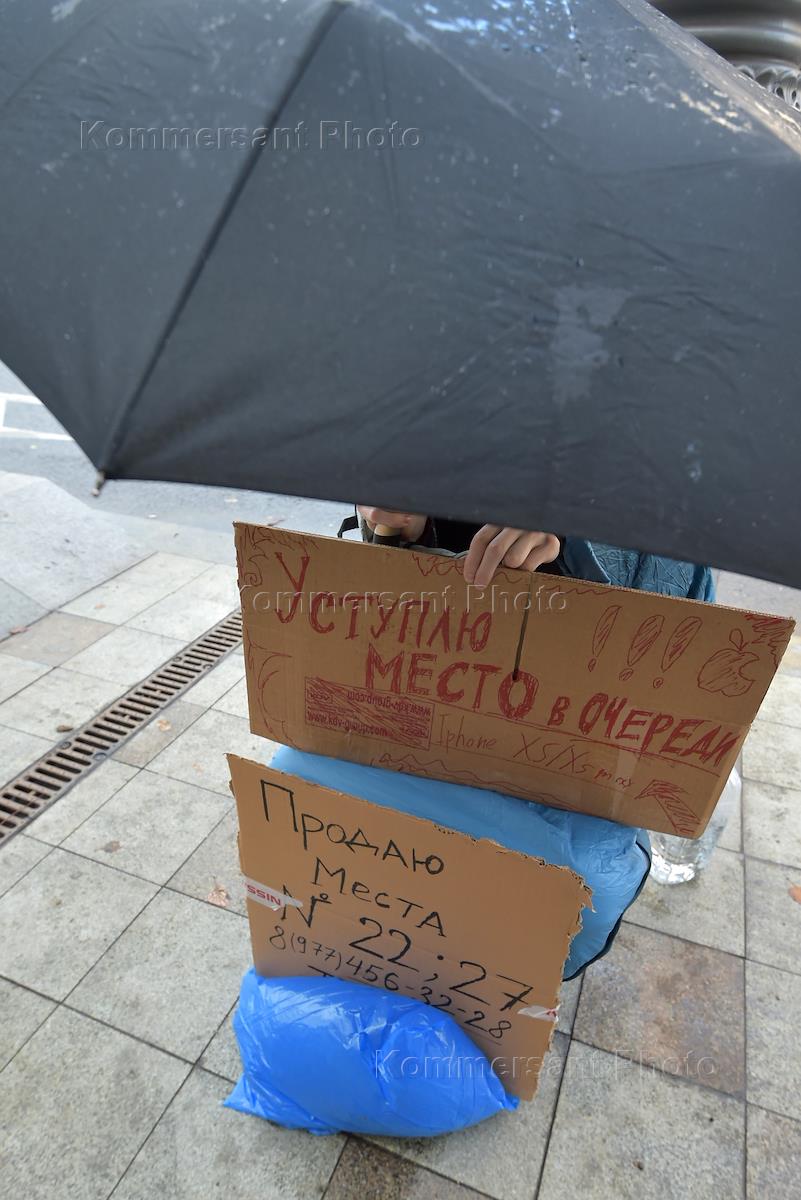 Очередь за смартфонами iPhone Xs перед флагманским магазином re:Store на Тверской улице. Объявления о продаже и уступке очереди.