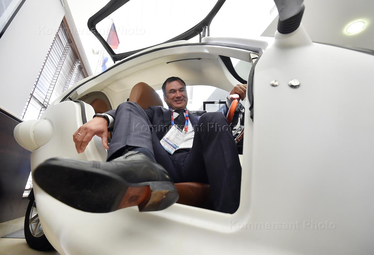 III Международный форум и выставка "Интеллектуальные транспортные системы России" в отеле Holiday Inn Moscow Sokolniki. Член комитета Государственной думы России по транспорту и строительству Сергей Тен в кабине электромобиля SAM на выставке.